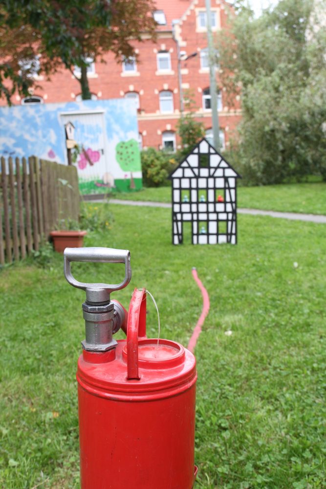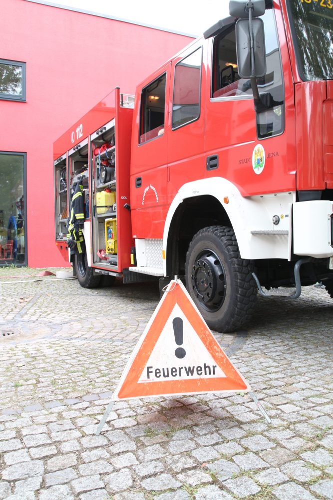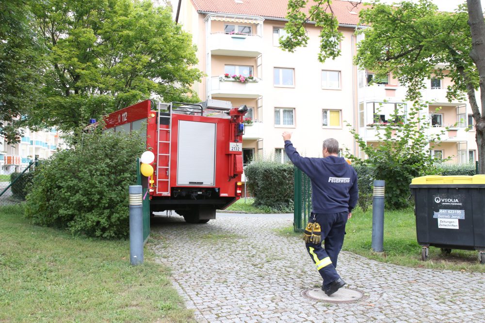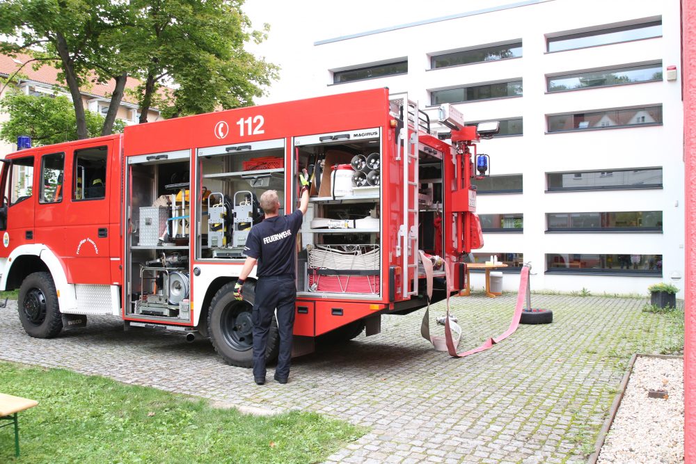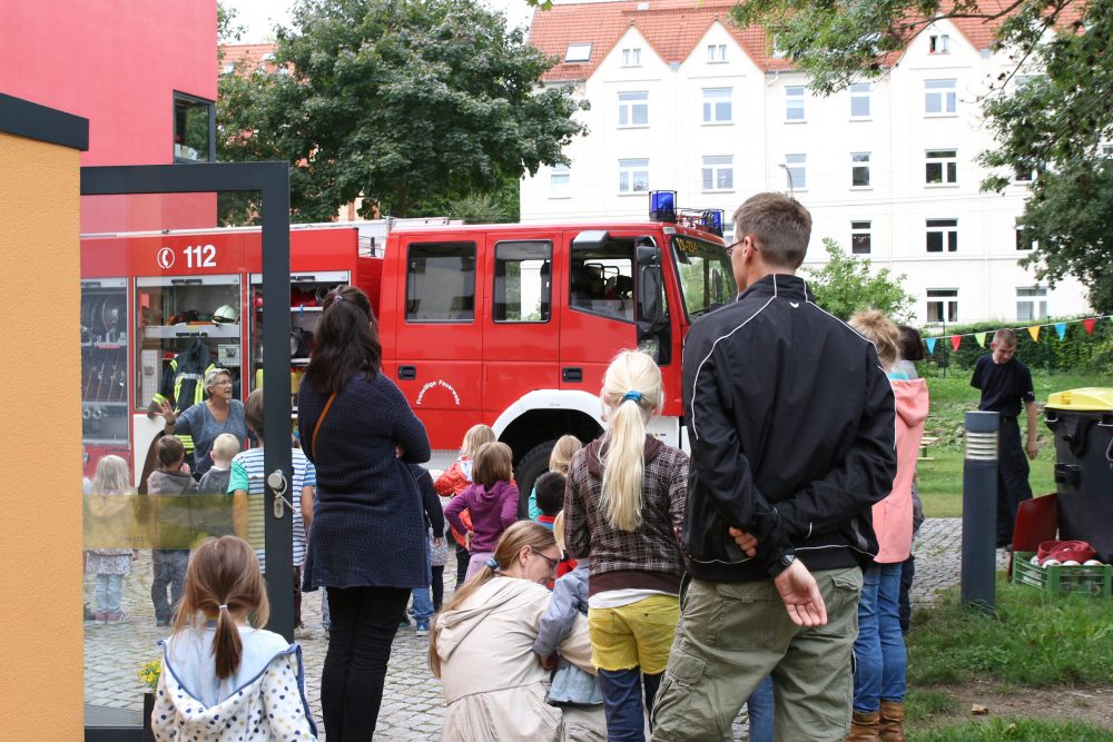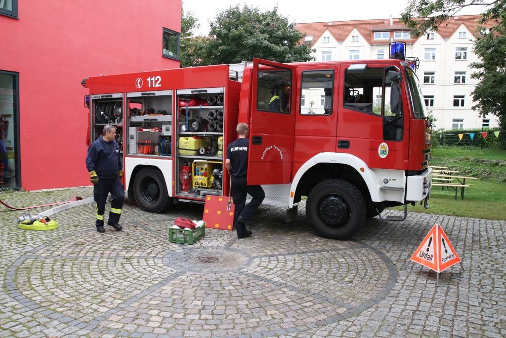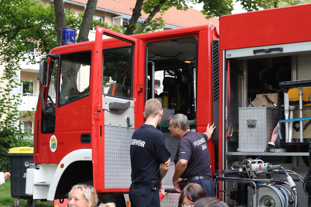 Als große Überraschung fuhr ein Einsatzwagen der Feuerwehr Jena auf das Gelände. Nicht nur Kinderaugen leuchteten vor Staunen und Freude auf. Zwei Feuerwehrmänner standen mit Rat und Tat zur Seite, beantworteten geduldig Fragen, halfen bei der Wasserspritzpumpe aus und ließen alle Interessierten auf ihrem Fahrzeug Probe sitzen.