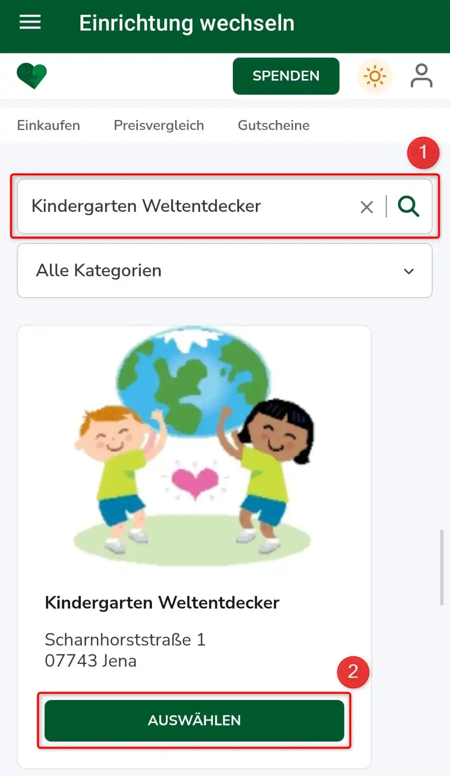 Tippt in die Suchleiste (1) „Kindergarten Weltentdecker“ ein und startet die Suche über die Lupe. Wählt abschließend unsere Einrichtung aus (2).